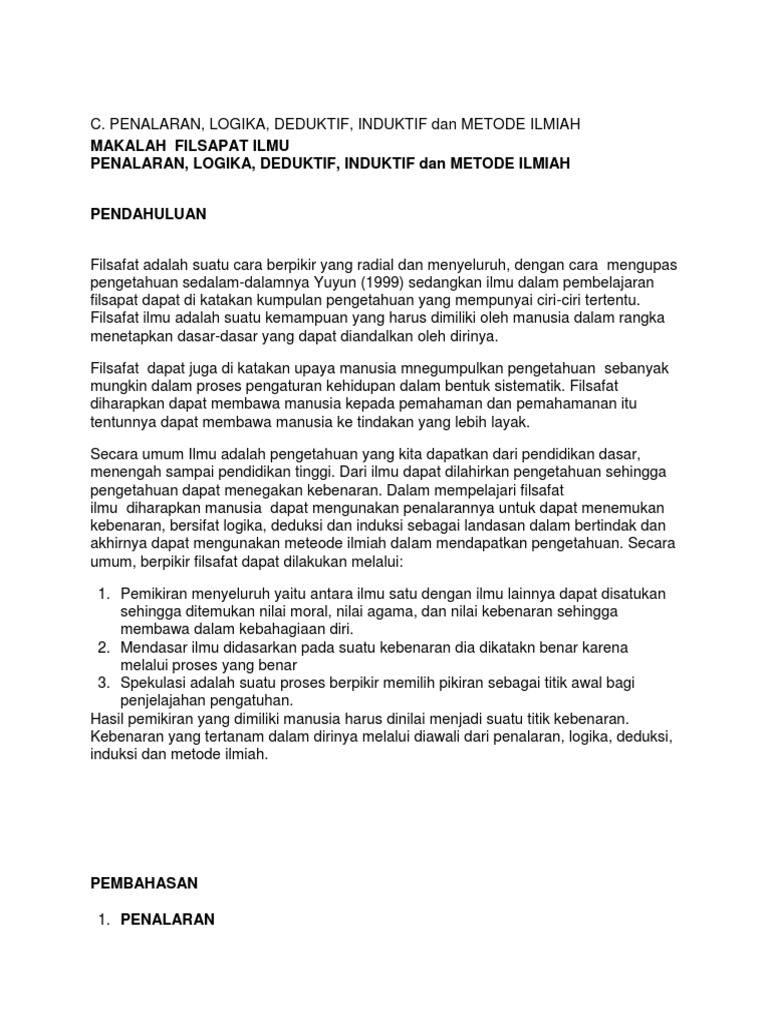 (philosophy of specific science) seperti. Apakah yang dimaksud dengan penalaran induktif ? Latar belakang masalah pencarian pengetahuan yang dalam penalaran induktif terdapat 3 bentuk penalaran yaitu : Kemampuan menalar ini menyebabkan manusia mampu mengembangkan pengetahuan yang merupakan rahasia penalaran merupakan suatu kegiatan berpikir yang mempunyai karakteristik tertentu dalam menemukan kebenaran. Pengertian dan penjelasan penalaran deduktif.